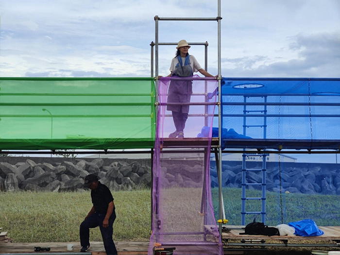 同じ2023年の夏にNew Land on the old Groundのリサーチの立ち寄り先のひとつとして白老を訪れた渡部睦子には、偶然にも白老との縁がつくられました。2024年は、アートプロジェクト『ルーツ&アーツしらおい2024』の『kan-yo studio beta」』という企画に、スタジオアーティストとして参加し、トーク、ワークショップを行いました。そして、今年2025年の夏、白老町で開催された「海の家」、「ルーツ&アーツしらおい2025」に、渡部が招聘されました。海との関わり、その場所に滞在した記憶が再構成されて今秋、モエレ沼公園で展示されます。