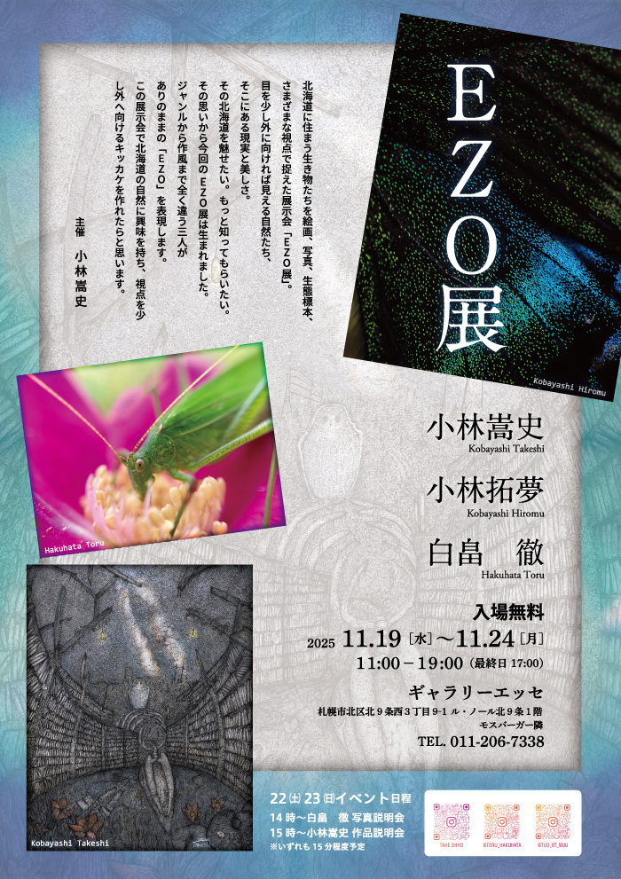 北海道に住まう生き物たちを、小林嵩史(絵画)・小林拓夢(ジオラマ標本、写真)・白畠徹(写真)の三人の視点で捉えた展覧会「EZO展」。