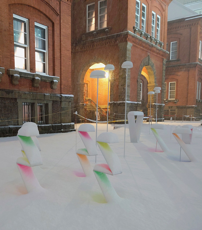 札幌の美術家・澁谷俊彦氏の全面協力のもと、北国ならではの地域特性を生かし、雪面にカラフルな色彩を表出させる冬の野外アート「スノーパレット」を前庭に展示します。この作品は、世界33の国と地域で発行されているインテリア雑誌『ELLEDECOR(エル・デコ)』イタリア版や、中東および中央ヨーロッパの高級誌『CANVAS MAGAZINE』などでも紹介され、海外でも高い評価と人気を集めています。